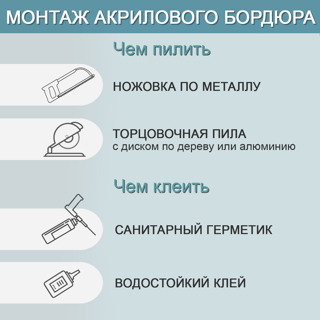 Для распила потребуется ножовка по металлу или торцовочная пила с диском по дереву или алюминию, монтаж производится на герметик или водостойкий клей.